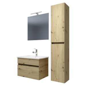 Ta prefinjen kopalniški blok se ponaša z minimalističnim dizajnom, ki vključuje omarico z enim prostornim predalom, elegantno ogledalo ter LED osvetlitev. Predal brez ročaja ohranja čiste linije in sodoben videz. Na voljo je v različnih barvah in velikostih, prilagojenih vašim potrebam.